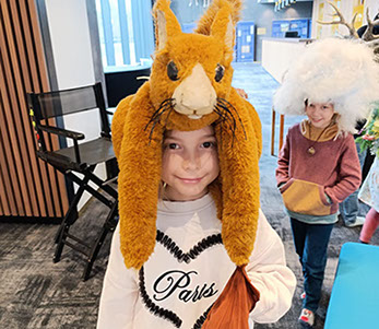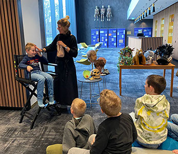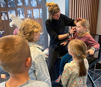 Im Inneren des Theaters erwartete uns ein Blick hinter die Kulissen: Wir durften die Bühne erkunden und sogar einmal in den gemütlichen Zuschauersitzen probesitzen. Anschließend erhielten wir spannende Informationen über die vielfältigen Aufgaben des Maskenzaubers im Theaterbetrieb. So erfuhren wir zum Beispiel, dass die Anfertigung einer Perücke bis zu 60 Stunden dauern kann! Neben Haarteilen entstehen hier auch Kunstnasen und viele weitere Requisiten – alles in sorgfältiger Handarbeit.