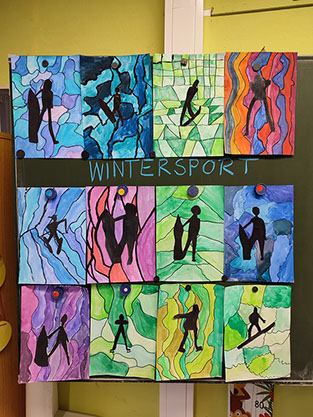 Mit viel Fantasie und Wasserfarbe hat die Klasse 4b das Thema Wintersport künstlerisch umgesetzt. Die selbst gezeichneten Figuren bewegen sich vor Hintergründen in jeweils einer Farbfamilie und zeigen, wie vielfältig und lebendig Wintersport sein kann.