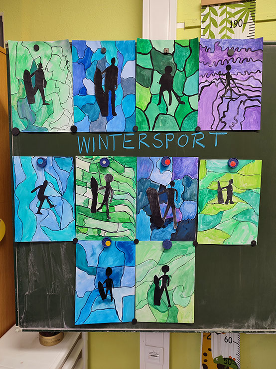 Mit viel Fantasie und Wasserfarbe hat die Klasse 4b das Thema Wintersport künstlerisch umgesetzt. Die selbst gezeichneten Figuren bewegen sich vor Hintergründen in jeweils einer Farbfamilie und zeigen, wie vielfältig und lebendig Wintersport sein kann.