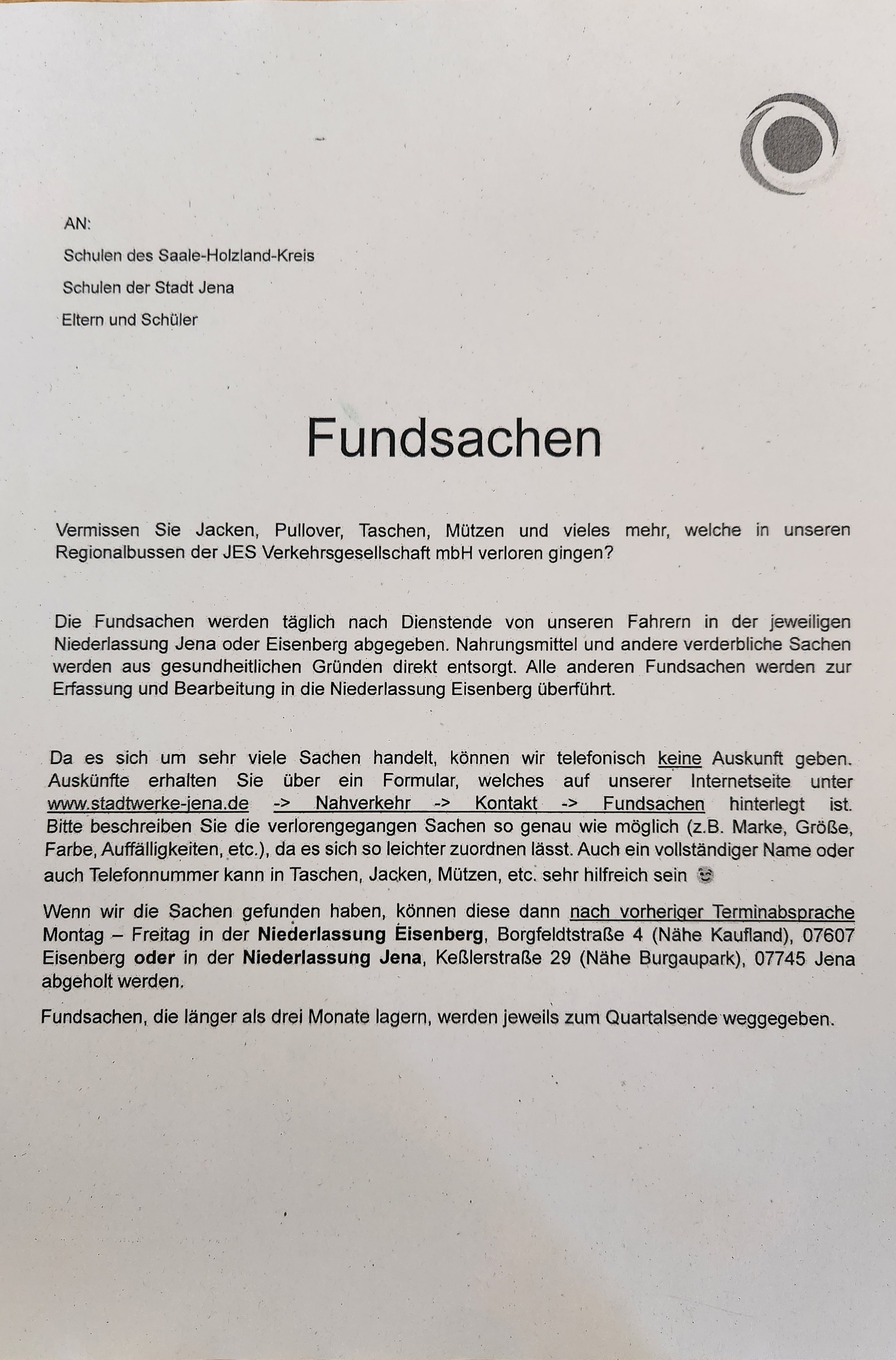 Informationsblatt der JES Verkehrsgesellschaft bezüglich Fundsachen.