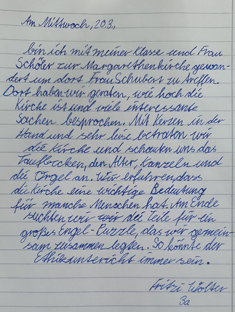 Zum Schluss trafen wir uns für eine gemeinsame Verabschiedung auf dem Schulhof. Im Anschluss gab es dann die wohlverdiente Pizza in den Klassen. Die Erstklässler erhielten zudem eine selbst hergestellte ukrainische Puppe.