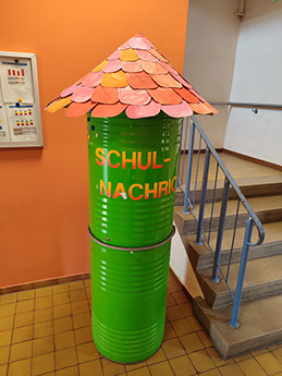 Die Klasse 2b half im Werkunterricht mit Frau Schöler mit, dass Dach unserer Litfaßsäule zu reparieren. Es hatte leider ein großes Loch bekommen. Zunächst besichtigten die Kinder „die Baustelle“. Anschließend sammelten wir Ideen, wie das Dach repariert werden soll. Ziegel sollten her! Wir beschäftigten uns damit, wie diese aussehen sollten und stellten fest, dass dabei Symmetrie eine Rolle spielt. Dieses Thema wurde im Mathematikunterricht mit Frau Wolter bearbeitet und fand nun auch ganz praktische Anwendung. Die Kinder entwarfen Prototypen und wir einigten uns auf drei verschiedene Größen. Jetzt mussten die Ziegel aus fester Pappe gefertigt werden. Die Kinder nutzten ihre Schablonen, umfuhren diese und schnitten sie aus. Ein anderer Teil der Schüler bemalte sie fleißig mit Wasserfarbe. Das Ankleben der Ziegel übernahmen in den Ferien Frau Peter und Frau Schöler. Nun ist unsere Litfaßsäule wieder ein schöner Anblick.